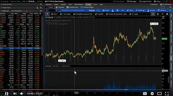 Stock indexes ended the week relatively flat as the small amount of volatility in the market was quickly sucked out. In this extended weekend edition let’s take a long term view of stocks and bonds. Where has the all the volume gone in stock market and will the recent changes in interest rates change that? Watch this important long term analysis of the stock and bond markets…