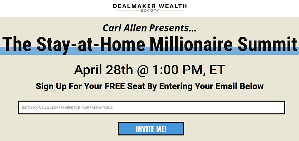 Carl Allen’s Stay-at-Home Millionaire Summit is FREE to attend. Follow this link to register. By entering your email address you’ll also receive a free subscription to the Confessions of a Dealmaker newsletter.