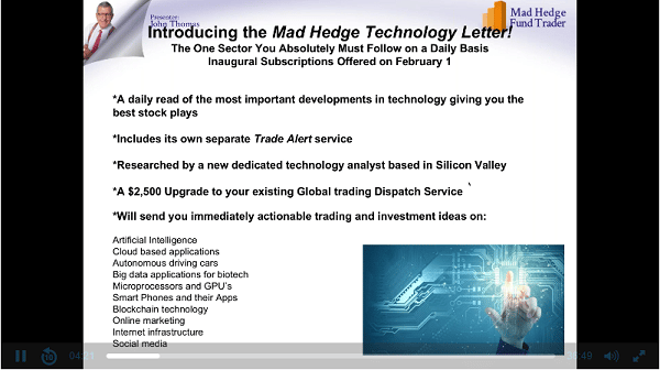 The most important and valuable investment newsletter of the decade has just been launched. What is Mad Hedge Technology Letter? Mad Hedge Fund Trader John Thomas is applying his half-century in technology investment towards the publication of the Mad Hedge Technology Letter. CLICK HERE TO WATCH THE WEBINAR >>> Place Your Order Here – 20% … Read more