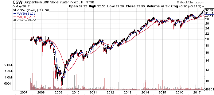 The best part – in May 2017, water was quickly emerging as one of the most investable natural resources on the planet. It was a classic tale of scarcity and falling supplies met with incredible global demand. Despite the fact that water covers much of our planet’s surface, only 3% of it is considered fresh. Less than 0.1% is safe for human consumption.