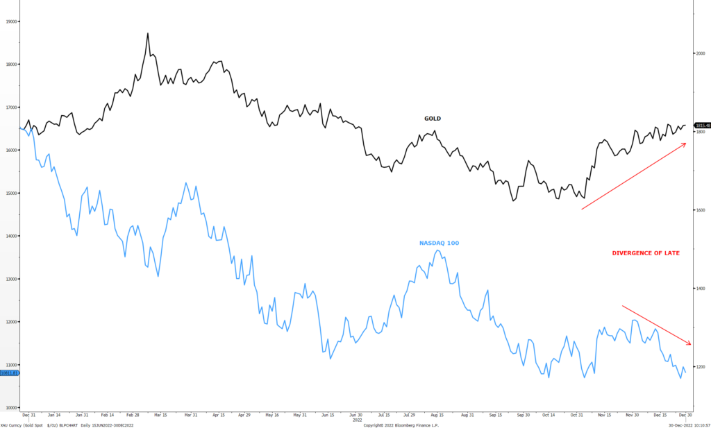 The price divergence between gold and the Nasdaq 100, combined with the divergence between other major market sectors, strengthens my conviction that 2023 is setting up for major tradable inflection points.
