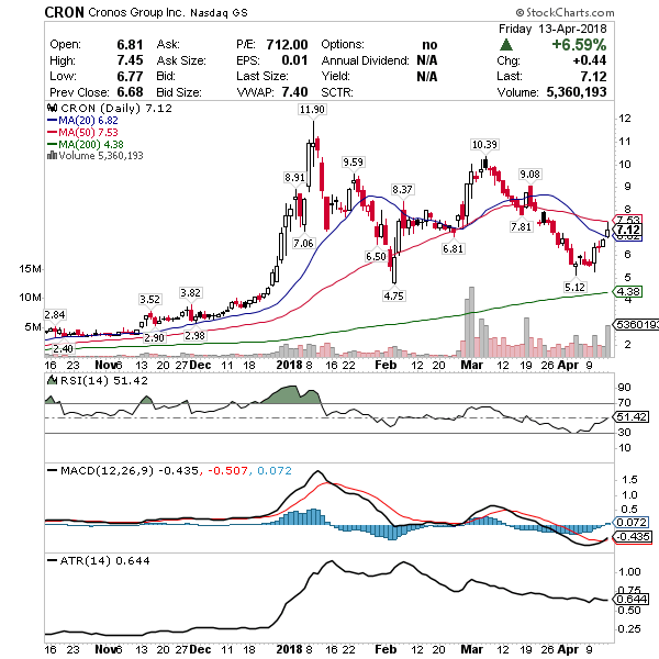 CRON – Pot stocks are heating up again after Trump abandoned the crackdown on legal marijuana last week. I am a little frustrated here since I’ve been watching for this oversold entry closer to $5 and missed it, but think it’s still in play off the MA(20) now and could see double-digits again here soon.
