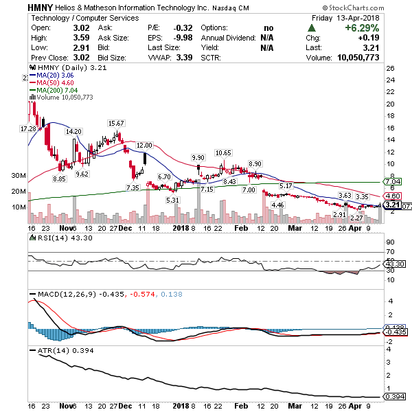 HMNY – Finally coming out of oversold I’m thinking it’s a good time to try the MoviePass trade again above $3.10. Recently the CEO predicted 5 million members gobbling up 20% of all movie tickets by the end of the year.