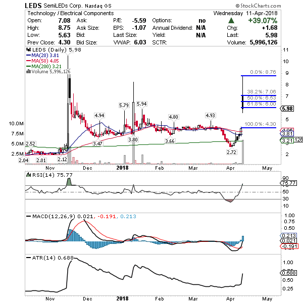 LEDS – Breakout chart pattern on news Wednesday, now watching for Fibonacci retracement into Friday. Historically this one doesn’t have the best history of continuation after it rests but since it’s Thursday, if it can find a bid and hold around $6 I think it’s worth a shot.