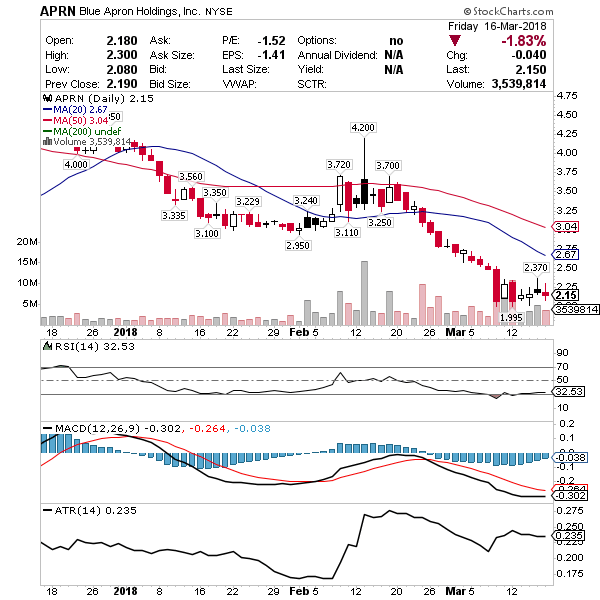 APRN – Meal kit company. Oversold chart pattern that probably goes lower today with the market. However, I’m watching $2 support like a hawk for a bounce. The company is due for good news and definitely a takeover target since meal kits aren’t going away.