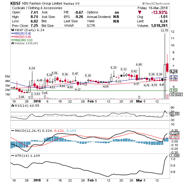 KBSF – Menswear fashion news winner last week. Continuation chart pattern in play above $6 for a move to $8. Likely attracted sellers Thursday and Friday into the $12 spike and could see some bounce now that it’s back to support.