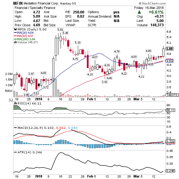 MFIN – Financial. Breakout chart pattern in play above $4.80 with range to $6 if it clears the $5.40’s. Strong trend since November and likely to try again here soon I think.