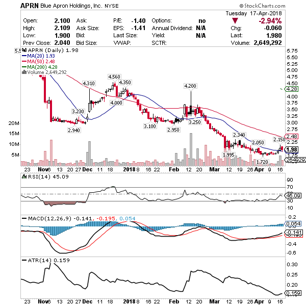 APRN – Shares started to bounce Monday on heavy volume as options sweeps hit scanners. With earnings coming up in early May, no doubt this depressed stock is heavily shorted and likely at a bottom until the call. I’m looking for a move to the middle $2’s for profit and am currently 1/2 size in my position.