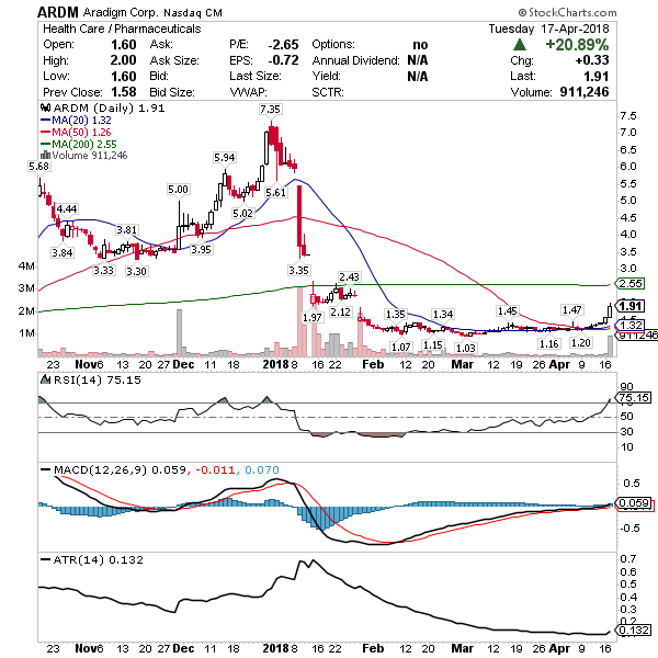 ARDM – Big jump in volume Tuesday on no news. Short cover didn’t add up in my mind, not after 3-months of basing without a pop. Instead I like to speculate someone knows something and a pop like that could be news coming. I went tiny on this since guessing news is hard, but I’ve got pretty good odds looking at charts and hitting good news in 1-4 days, so we’ll see if this rounding is in fact just that or just a technical pop after months of boredom.