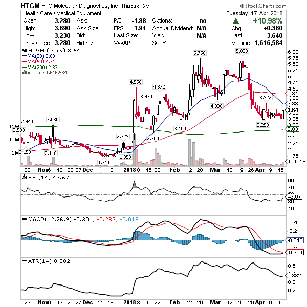 HTGM – History of huge 100%+ spikes in a short period of time. Nearly oversold for about a month after falling from about $6 to $3, so basically my oversold chart pattern on a near-term basis, continuation pattern across this 6-month chart. In play in this base with the MACD crossing the signal line, often an indicator of a big move to come. Something around the MA(50) sure would be a nice bounce. I jumped in Tuesday due to the volume increase, which hasn’t been seen for a month.