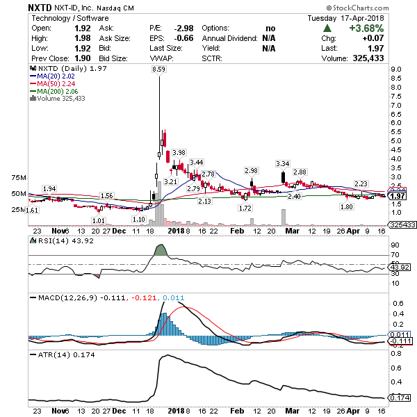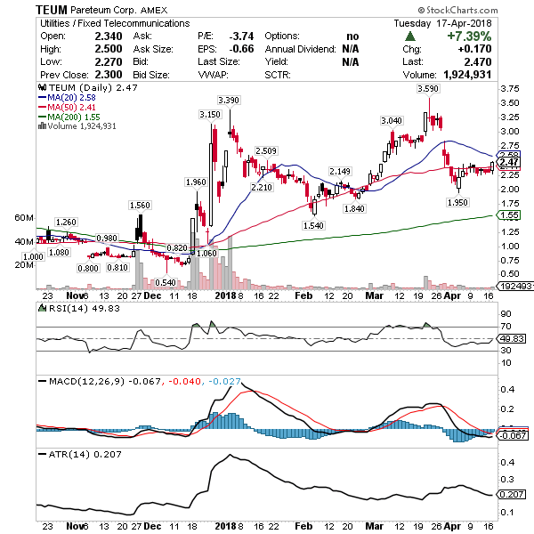 TEUM – Lots of tradable action on this one in the last 6-months and my favorite bitcoin stock into the weekend, as of right now anyway, due to the nice rise in volume Tuesday, MACD about to crossover the signal line, solid base above $2.20’s and big upside to middle $3’s if it trends, which it’s done many times in the past.