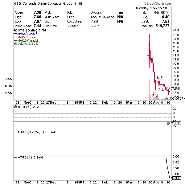 STG – Oversold chart pattern and a big opportunity stock in China, the IPO came in around $12, it went to nearly $15 then sold off. Now well into oversold with the MACD rounding, I like this for a move to double-digits in the near term. StockCharts doesn’t reflect the oversold condition and momentum well, so I’ve linked the FINVIZ chart for you here so you can see what I see.