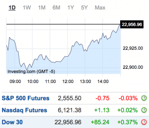 - The DOW ended 0.4% higher. Adding 85 points, the DOW closed at 22,957.