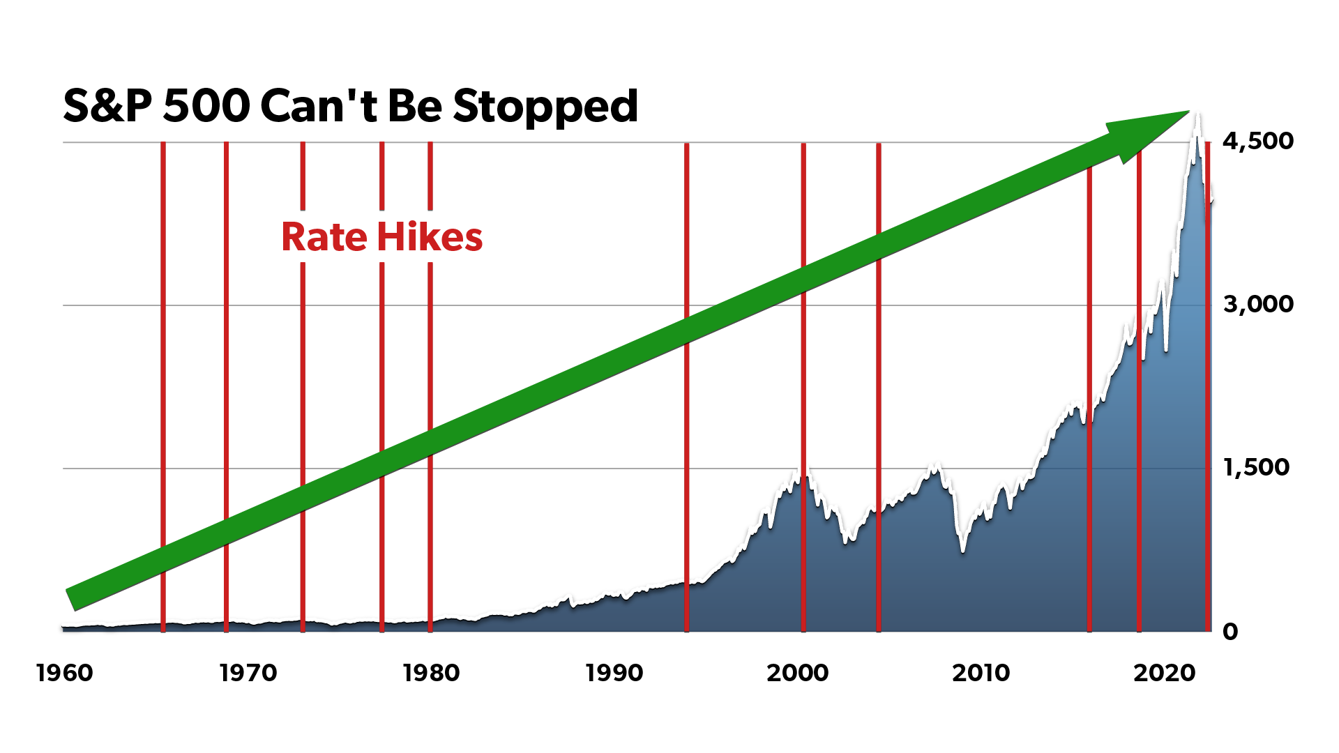 Compare that to the U.S. stock market over the same amount of time… you can see pretty clearly that rising interest rates alone aren’t a death blow for bull markets…