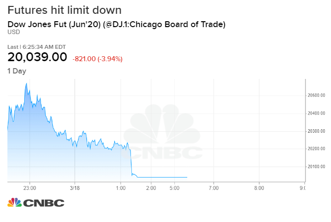Exchange-traded funds that track the indexes are not subject to limit-down restrictions, however, and suggested what the open would look like. The SPDR S&P 500 ETF was down 6% in premarket trading, the SPDR Dow Jones Industrial Average ETF was down 6.5%, and the Invesco QQQ Trust was off 5.8%.