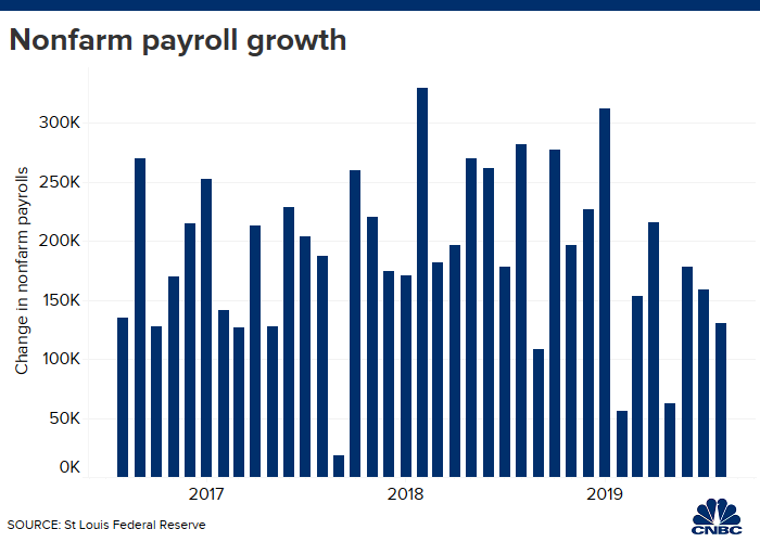 Jobs, on the other hand, have been strong, as has the consumer, the biggest driver of the economy. Economists expect that just 75,000 jobs were created in October, and the unemployment rate is expected to tick up slightly to 3.6% from 3.5%, according to Dow Jones. Hourly earnings are expected to rise by 0.3%, or 3% year over year. The 8:30 a.m. ET report follows September’s surprisingly weak 136,000 payrolls.